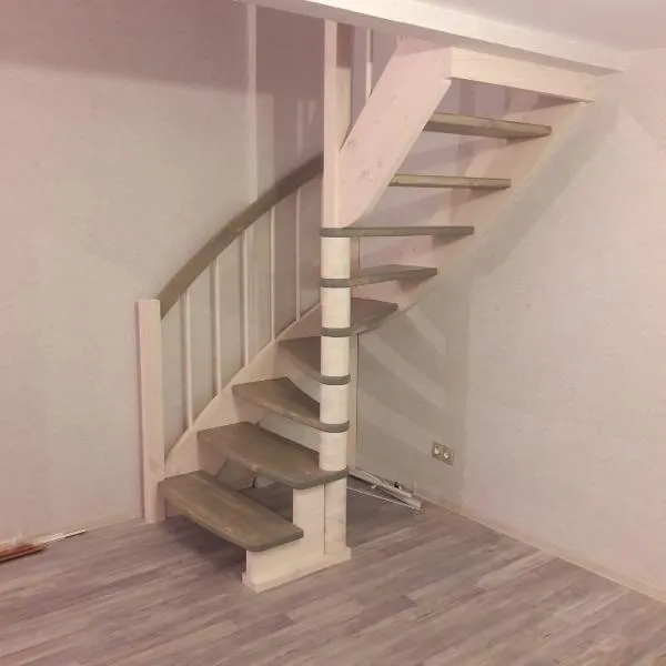 Короб из металла, белого цвета. Крышка лестницы выполнена из ДСП древесного цвета.