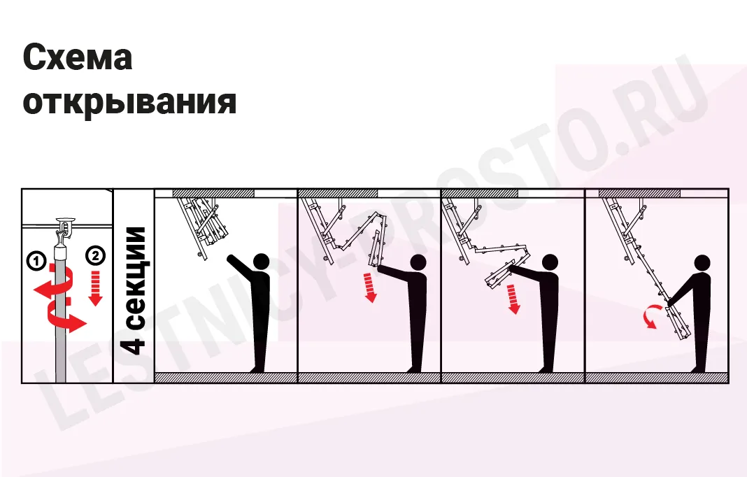 Складная 4-х секционная чердачная лестница. Ступени выполнены из сосны, имеют противоскользящие насечки, направляющие из металла.