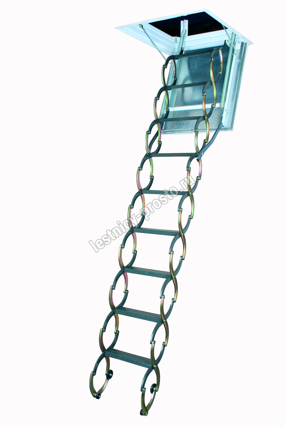 Благодаря «ножничной» системе складывания в сложенном виде лестница LSF очень компактна, и соответственно имеет небольшой размер крышки люка. Специальный механизм регулировки угла открывания крышки люка позволяет подогнать высоту лестницы под высоту потолка.