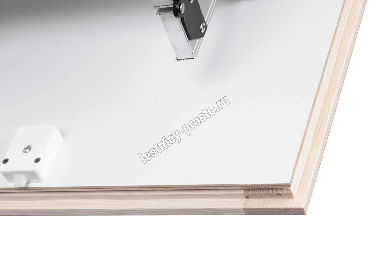 Складная 3-х секционная чердачная лестница. Рабочая поверхность полностью выполнена из алюминия. Термоизоляционная крышка типа "сэндвич" имеет усиленную теплозащиту, облицована с двух сторон ДВП белого цвета. По контуру короба имеется уплотнитель; Все металлические элементы лестницы покрыты порошковой краской.
