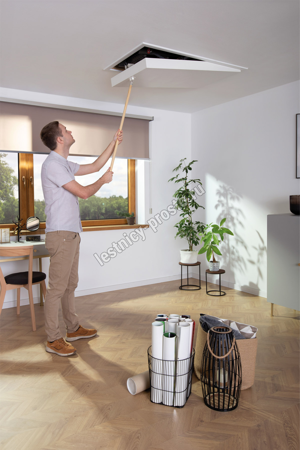 Лестница представляет собой складную конструкцию из металлического лестничного марша и термоизоляционного люка.