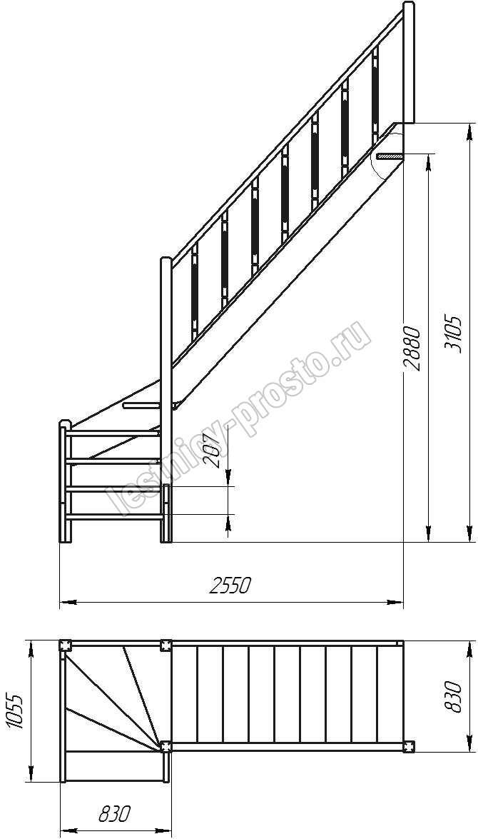 Деревянная межэтажная лестница ЛЕС-07 2880-3085 проем 2550-830, Бук