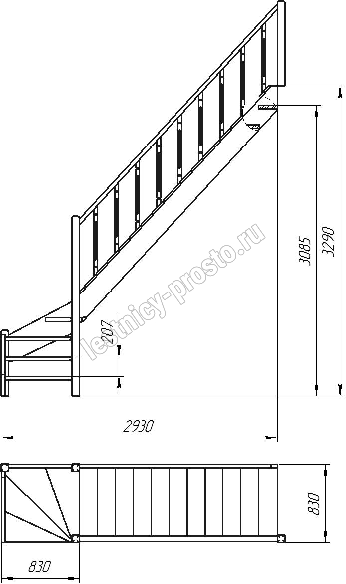 Деревянная межэтажная лестница ЛЕС-07 3085-3290 проем 2930-830, Бук
