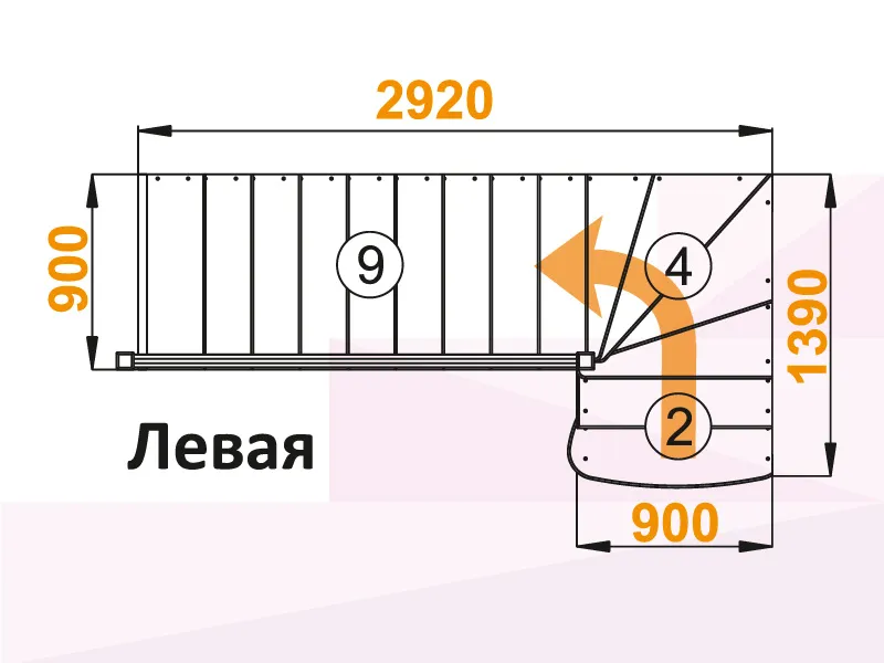 Поворот осуществлён с помощью 4х забежных ступеней, первая ступень лестницы пригласительная (скруглены внешние углы)