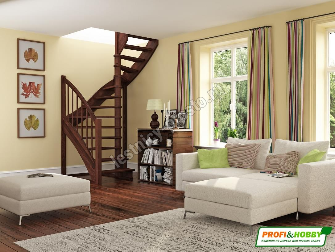 Ступени и поручень лестницы изготовлены из сращенного дуба, остальные элементы лестницы (тетивы, столбы, балясины...) из массива сосны. Возможно изготовление данной модели полностью из дуба. Базовый комплект включает в себя деревянные элементы лестницы и ограждения без какого-либо покрытия. Вы можете заказать у нас покраску лестницы в цвета, отвечающие особенностям вашего помещения.