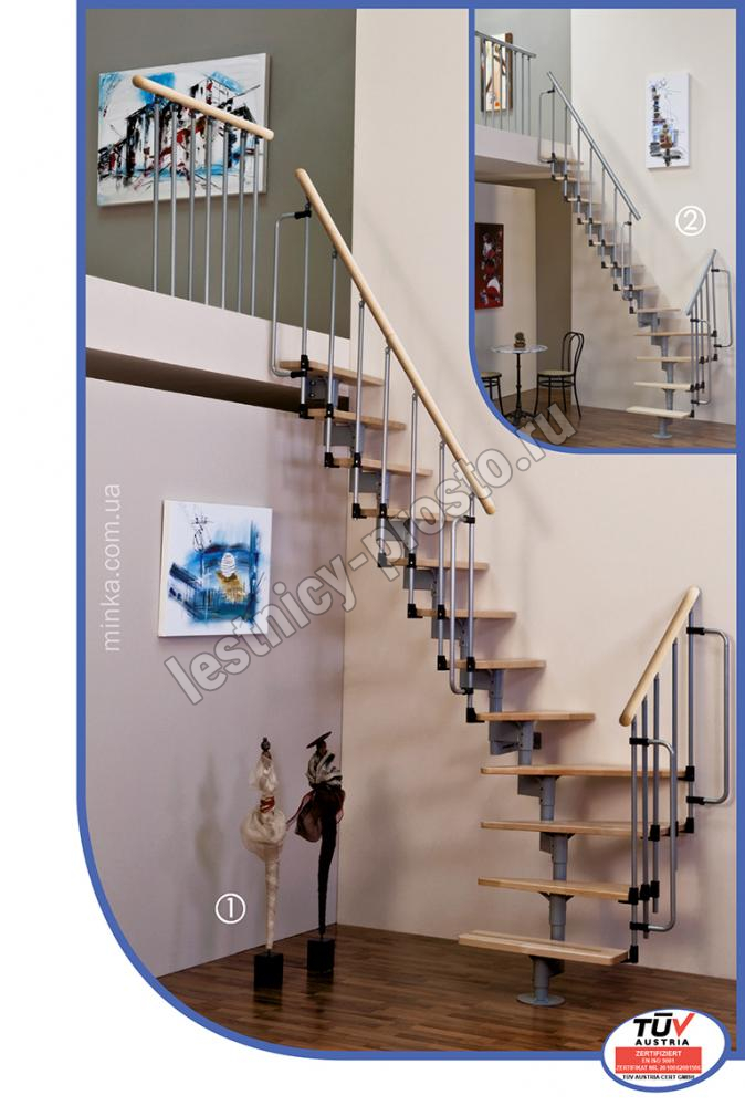 Поручень лестницы JOKER 700 покрыт порошковым покрытием "под дерево", в тон ступеням. Ступени изготовлены из бука и покрыты износостойким фирменным защитным лаком Minka.