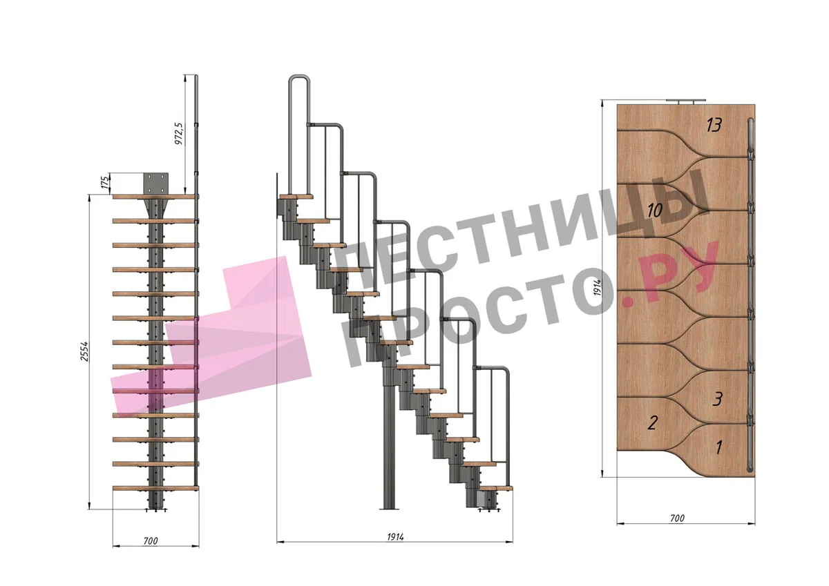 Лестница Prosto Urban Black гусиный шаг 700 мм, h234-336 см (13 ступеней), ясень