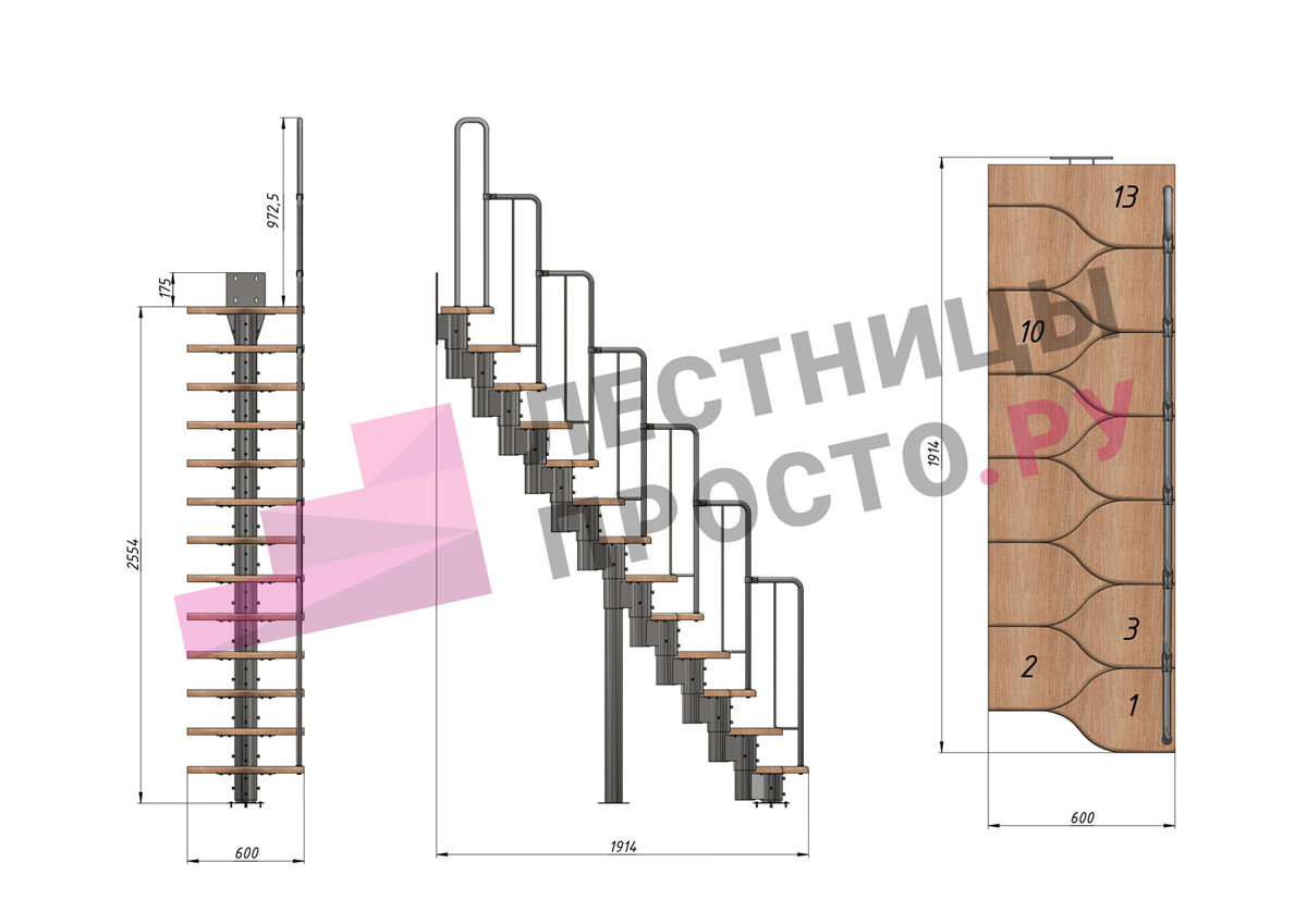 | Лестница Prosto Urban White гусиный шаг 600 мм, h216-312 см (12 ступеней), бук |