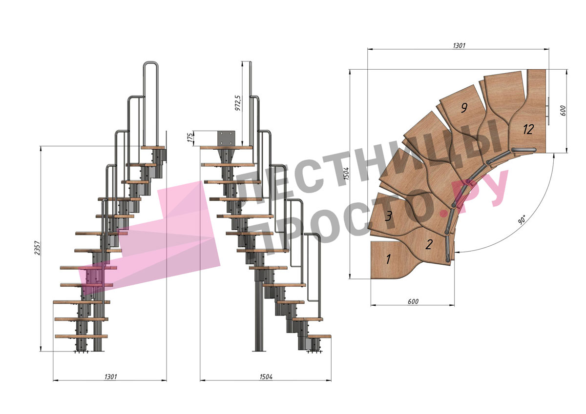 | Лестница Prosto Urban White гусиный шаг 600 мм, h216-312 см (12 ступеней), дуб |