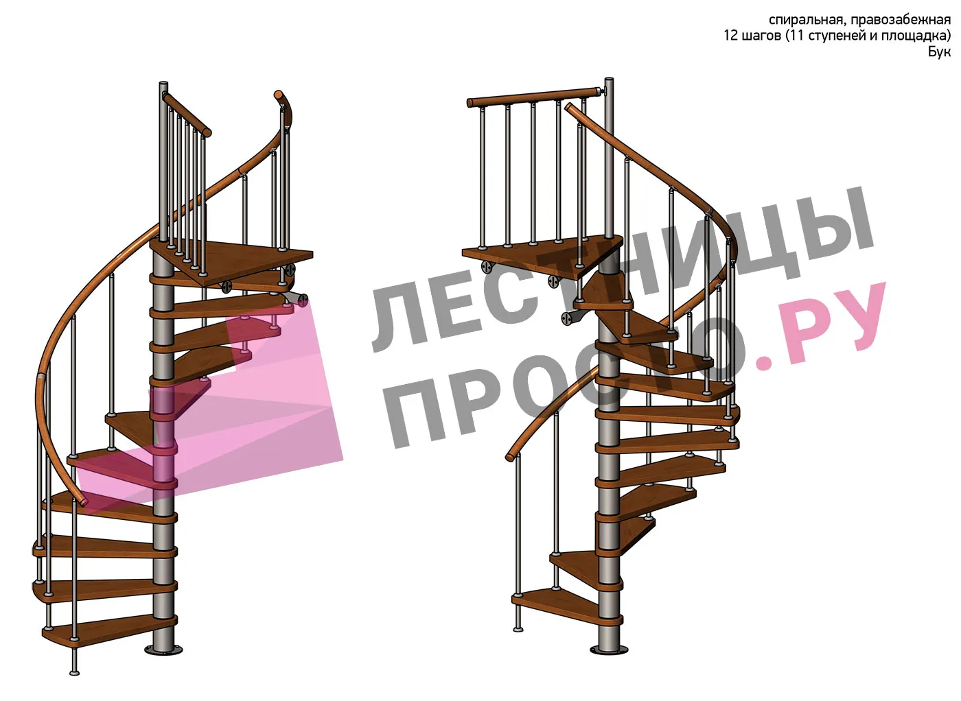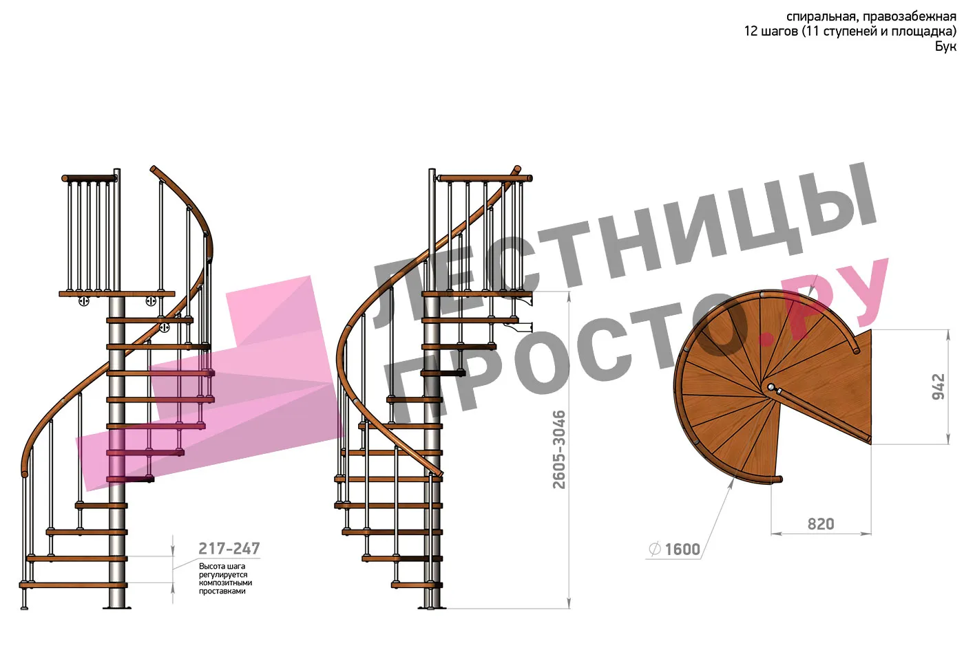 Решение о направлении поворота принимается при сборке лестницы - универсальная конструкция позволяет собрать правозабежную и левозабежную лестницы. Высота ступеней регулируется с шагом 3 мм. в пределах 217-247 мм., благодаря чему, лестница прекрасно подгоняется под необходимую высоту.