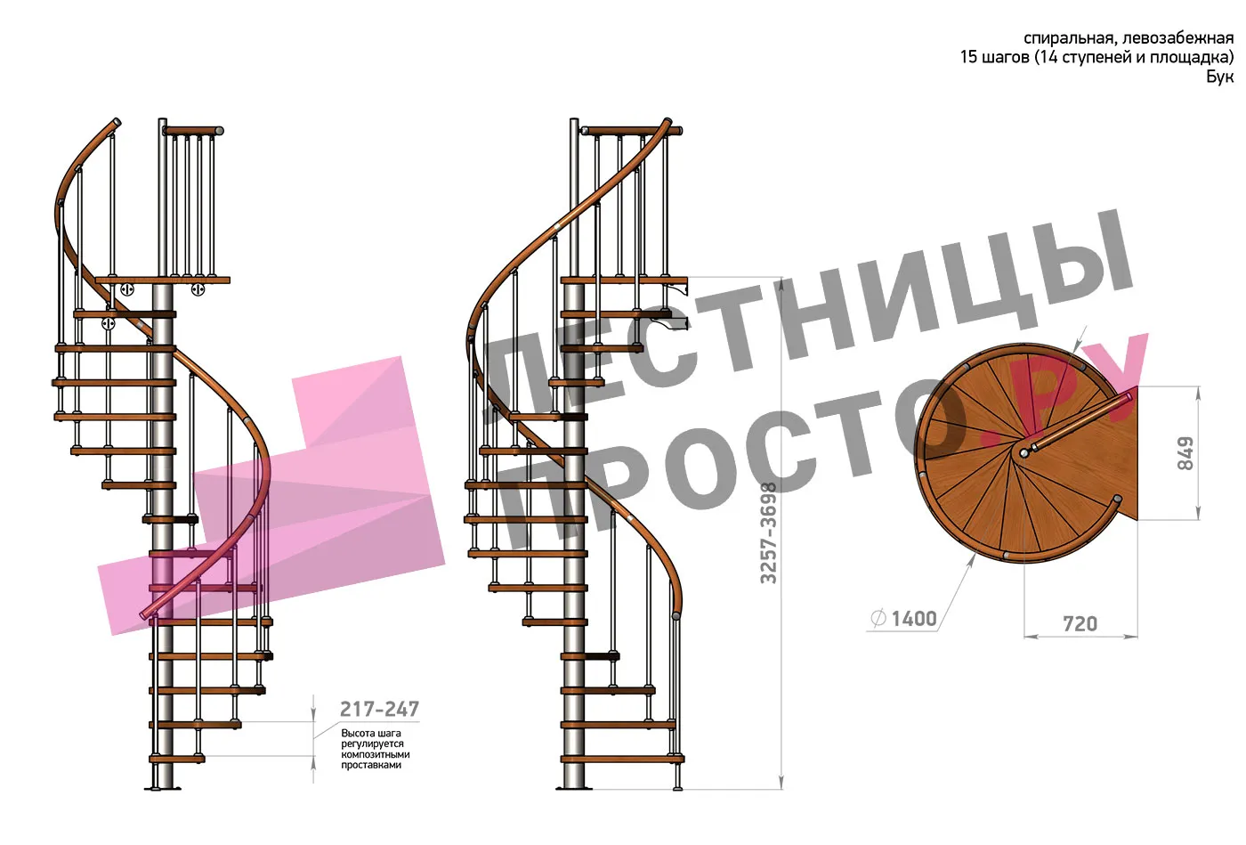 Левая, d=140см, 14 ступеней + площадка