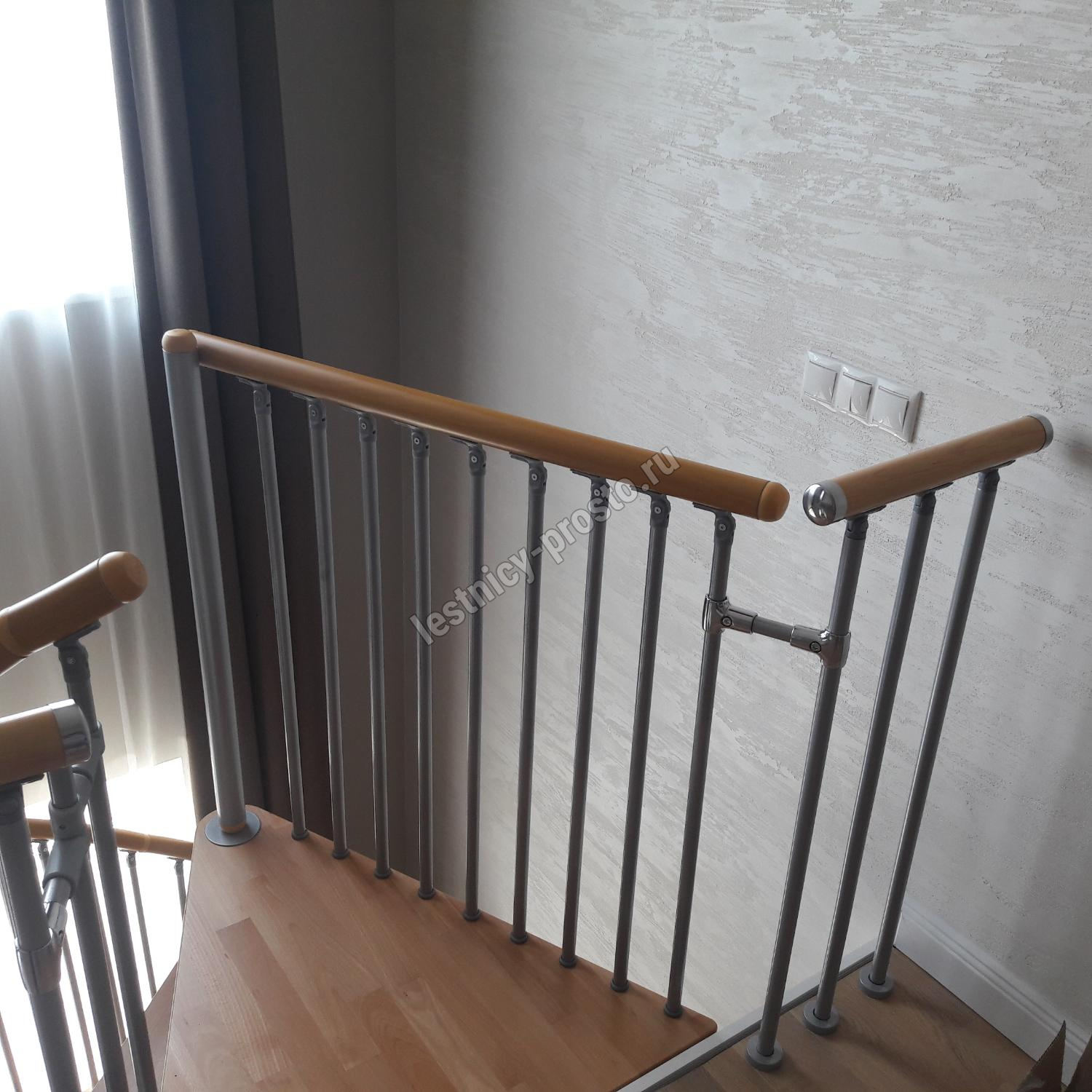 Поручень лестницы изготовлен из массива бука в тон ступеням. Ступени и поручень покрыты износостойким защитным лаком.