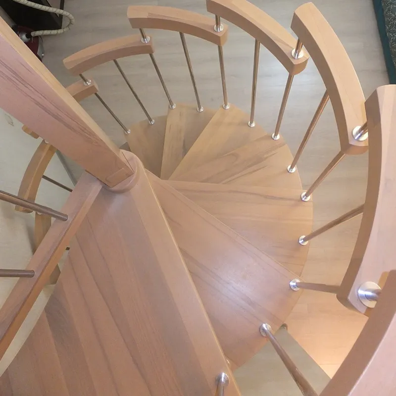 Ступени лестницы изготовлены из бука по технологии MULTIPLEX и покрыты износостойким защитным лаком. Лестница монтируется как по часовой стрелке, так и против. Возможен монтаж в круглый или квадратный проём. Ограждение: стальные трубки, Ø25 мм RAL 9006. Поручень: гибкий цельный ПВХ-поручень Ø40 мм серого цвета. Конструкция и балюстрада окрашены порошковым способом в серый цвет (RAL 9006).