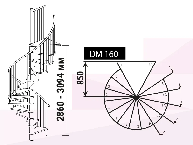 Лестница представлена в двух вариантах: с поворотом направо и с поворотом налево. Благодаря возможности регулировать высоту шага с помощью пластиковых вставок (входят в базовый комплект), высоту лестницы можно варьировать в пределах от 2860 до 3090 мм. Кроме того, купив дополнительную секцию для этой лестницы, можно поднять высоту до 3320 мм.